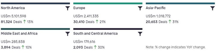 The volume of deals recorded by GlobalData also increased YoY in South and Central America (30%), Europe (21%) and Middle East and Africa (10%).